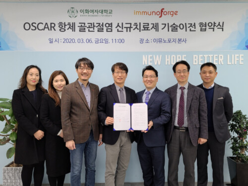 이뮤노포지의 안성민 공동대표는, 지난 6일 서울대학교 내 이뮤노포지 본사에서 이화여대와 OSCAR 항체 신규치료제에 대한 기술 도입 계약식을 체결하고, 양 기관이 서로 협력하여 글로벌 시장에 진출하기 위한 First-in Class 퇴행성 관절염 신약을 개발하기로 합의했다고 밝혔다.