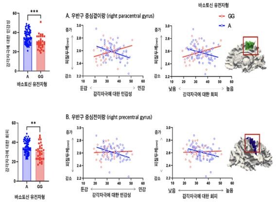 실제로, 바소토신수용체의 특정유전자(rs1042615 A-carrier)를 가진 사람이 그렇지 않은 사람보다 감각자극에 대한 민감도가 높고, 사회관계에서 회피 경향이 크며, 중심앞이랑(Precentral Gyrus) 뇌표면이 얕아지는 것을 알 수 있었다. 이는 특정 유전자가 뇌구조 발달에 영향을 주며, 감각의 민감성에 관여를 하여 자폐스펙트럼 장애의 사회성 문제에도 영향을 준다는 것을 의미한다고 연구팀은 설명했다.