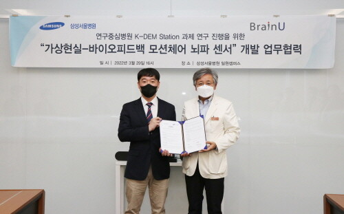 [mdtoday=이재혁 기자] 삼성서울병원 디지털치료연구센터는 브레인유와 연구중심병원육성 R&D 사업 ‘K-DEM(Digital&Electronic medicine) Station 구축’ 과제 연구 진행과 가상현실-바이오피드백 뇌파 센서 개발을 위한 업무협약(MOU)을 체결했다고 31일 밝혔다.