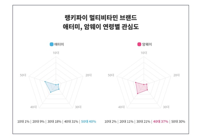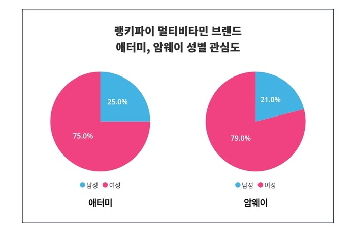 또한 성별 관심도에서도 애터미는 여성에게 75%로 높은 관심을 받았고, 암웨이는 여성에게 79%의 지지를 받고 있는 것으로 분석됐다.