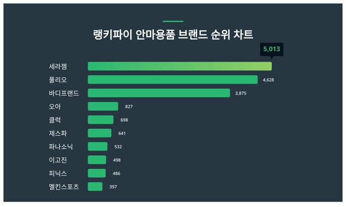 랭키파이에 따르면 4월 5주차 기준 안마용품 브랜드 트렌드지수 1위는 세라젬, 2위는 풀리오이다.