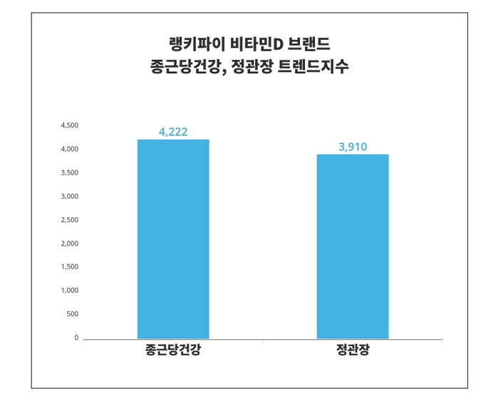 랭키파이의 최신 데이터에 따르면 비타민D 브랜드 트렌드지수 부문에서 종근당건강이 4222포인트로 최고점을 기록하며 선두를 유지하고 있다. 정관장이 3910포인트로 뒤를 따르고 있으며, 점수 차이는 312포인트이다.
