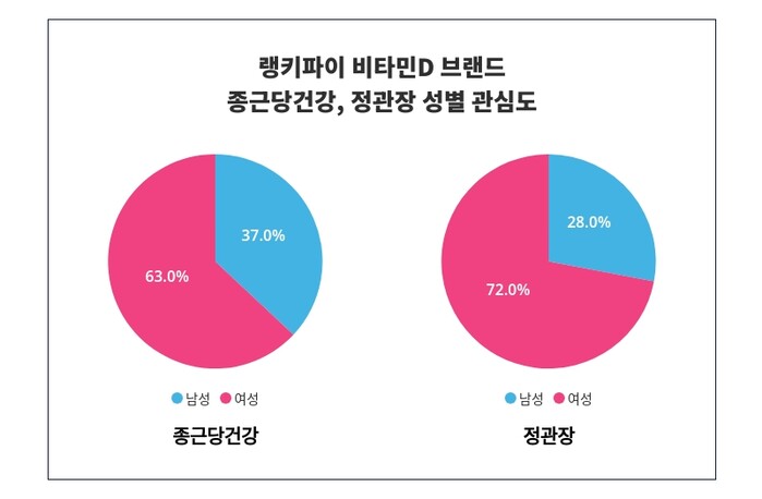 성별 관심도 분석에서 종근당건강은 여성에게 63%의 관심을 받고 있으며, 종근당건강은 남성보다 여성에게 높은 관심을 받고 있는 것으로 나타났다. 정관장은 남성보다 여성에서 높은 72%의 관심을 받았다.