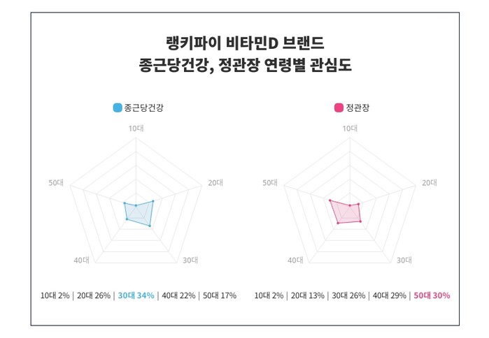 종근당건강과 정관장에 대한 연령별 관심도 조사에서, 종근당건강은 30대에서 가장 높은 34%의 관심도를 기록했다. 더불어, 종근당건강은 각 연령층에서 10대 2%, 20대 26%, 30대 34%, 40대 22%, 50대 17% 순으로 관심을 끌고 있다.