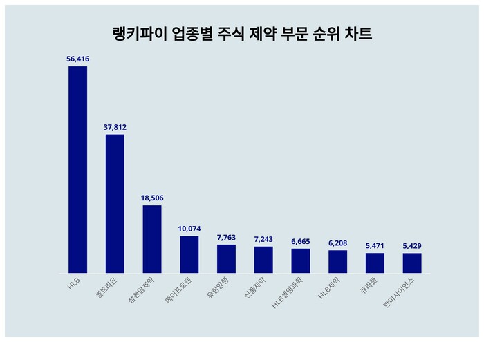 [mdtoday=정민주 기자] 랭키파이 4월 3주차 업종별 주식 제약 부문 트렌드 지수에서 HLB가 트렌드 지수 5만6416포인트로 1위에 올랐다.