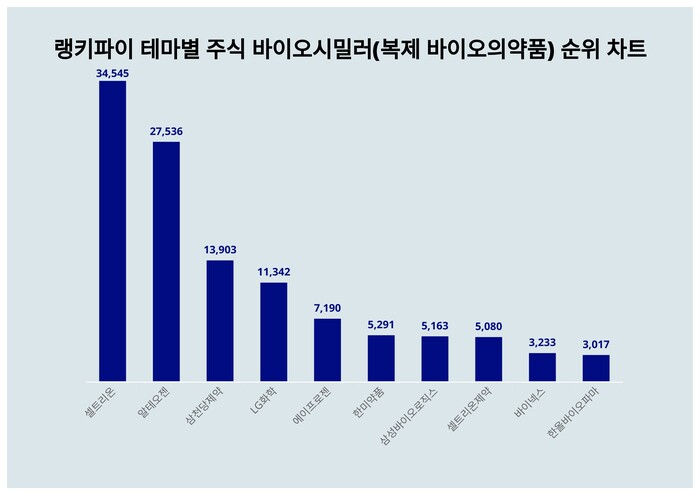 [mdtoday=정민주 기자] 랭키파이가 발표한 4월 4주차 테마별 주식 바이오시밀러(복제 바이오의약품) 트렌드 지수에서 셀트리온이 트렌드 지수 3만4545포인트로 전주보다 1188포인트 상승해 1위를 차지했다.