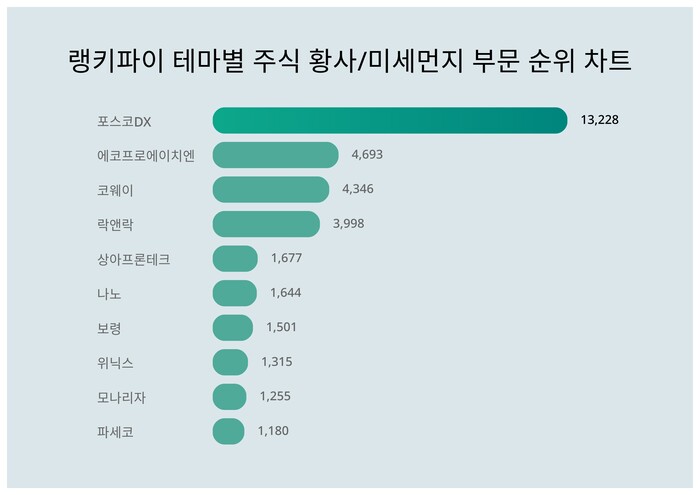 테마별 주식 황사/미세먼지 부문 트렌드 지수 분석 결과 (자료=랭키파이 제공)