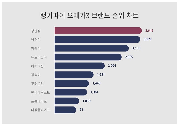 [mdtoday=정민주 기자] 랭키파이 4월 2주차 오메가3 브랜드 트렌드 지수에서 정관장은 트렌드 지수 3646포인트로 1위에 올랐다.