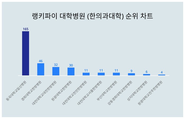 4월 3주차 대학병원 (한의과대학) 랭키파이 분석 결과 1위를 차지한 동국대학교일산병원은 트렌드 지수 165포인트로 전주보다 11포인트 하락했다.