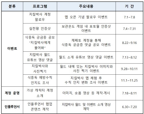 식약처는 지킬박사 월드 개방과 함께 1일부터 8일까지 8일간 ‘지킬박사 계정 팔로우 하기’와 함께 4일부터 31일까지 ‘식중독 예방 실천왕 인증샷’ 참여 이벤트등을 연중 진행할 계획이다.