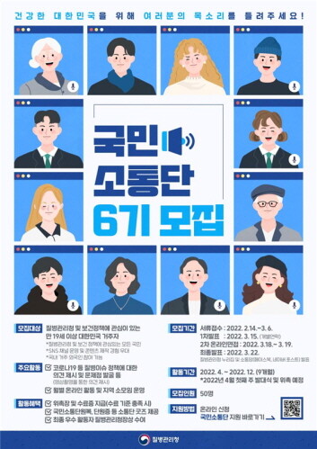 [mdtoday=이재혁 기자] 질병관리청은 지난 14일부터 내달 6일까지 약 3주간 코로나19 주요 방역 정책(방역수칙 준수, 예방접종 참여)에 대해 당국과 함께 고민하고 의견을 개진할 ‘국민소통단’ 6기를 공모한다고 16일 밝혔다.