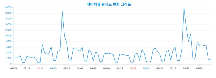 이번에 공개된 네이처셀 관련 90일간 트렌드 변화 그래프는 트렌드 변동을 데이터로 흥미롭게 보여주고 있다.