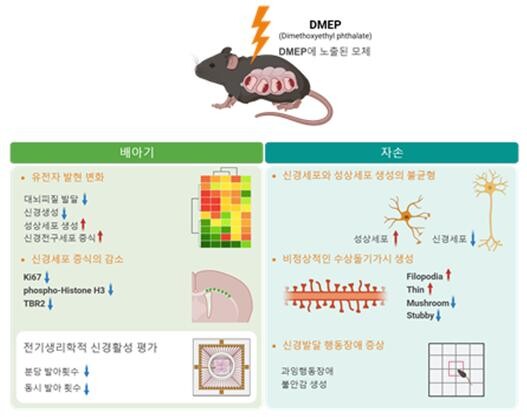 KIT 유전체손상연구그룹 가민한 박사 연구팀(현성애 박사, 고문이 연구원)은 실험동물을 통해 임신 중 모체가 DMEP에 노출되었을 때, 태아의 뇌 발달 단계에서 뇌 형태와 기능 및 신경세포 생성에 변화가 있음을 확인하였고 그 결과 행동장애까지 유발함을 검증했다.