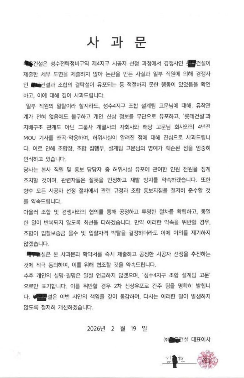 [mdtoday=유정민 기자] 대우건설이 서울 성동구 성수전략정비구역 4지구 재개발 시공사 선정 과정에서 발생한 각종 논란과 관련해 조합 측에 공식 사과문을 전달했다. 이번 사과는 최근 마감된 1차 입찰에서 발생한 서류 미비 사태와 경쟁사에 대한 악의적 루머 유포 등 입찰 지침 위반 의혹을 시인한 것으로 풀이된다.