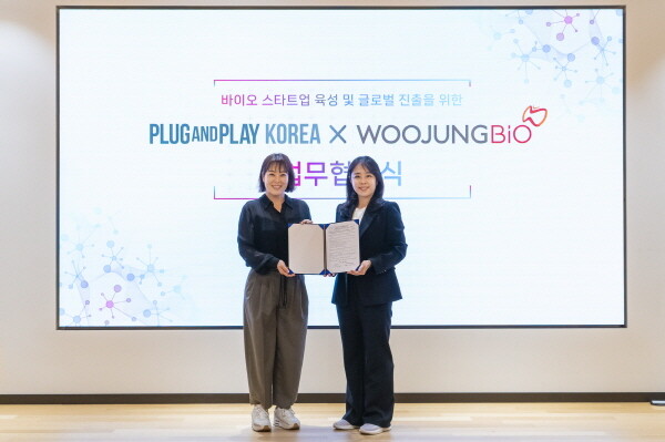| ▲ 우정바이오x플러그앤플레이 MOU 체결식. 좌측부터 플러그앤플레이코리아 정지원 총괄이사, 우정바이오 미래전략기획실 천희정 이사 (사진=우정바이오 제공) |