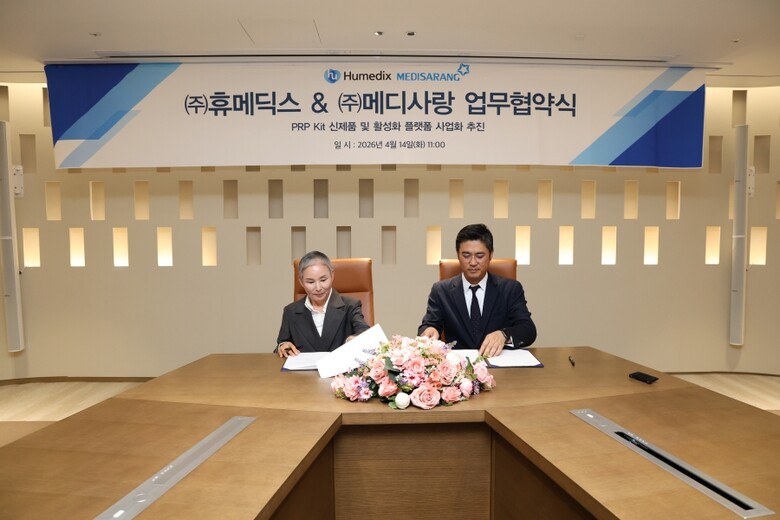 [mdtoday = 박성하 기자] PRP 키트 전문 제조사 메디사랑이 휴온스그룹의 에스테틱 전문기업 휴메딕스와 손잡고 PRP 신사업 공동 추진에 나선다. 제품 공급 협력을 넘어 기획·개발·마케팅·유통 전 과정에 걸친 전략적 파트너십을 구축함으로써, 국내 재생에스테틱 시장에서 새로운 성장 동력을 확보하겠다는 포석이다.