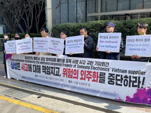 [mdtoday=김동주 기자] 시민단체가 베트남 협력업체 공장에서 일어난 메탄올 중독 사망 사고에 대한 삼성전자의 책임을 촉구했다.