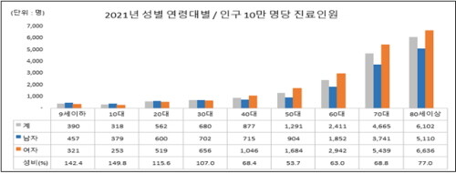 | ▲ 2021년 성별 연령대별 인구 10만 명당 진료인원 (자료=국민건강보험공단 제공) |