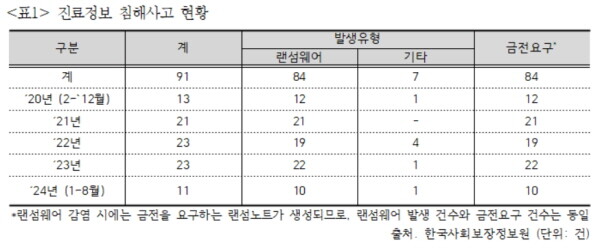 국회 보건복지위원회 소속 더불어민주당 전진숙 의원이 보건복지부, 한국사회보장정보원, 교육부, 한국인터넷진흥원으로부터 제출받은 자료에 따르면, 2020년 이후 총 91건 진료정보 침해사고가 일어났으며, 진료정보 이외의 침해사고 역시 129건에 달했다. 특히 서울대병원, 충남대병원 등 국립대병원에서도 15건의 침해사고가 발생했다.