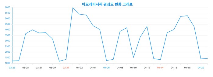 또한, 아모레퍼시픽에 대한 일간 변화 추이를 보여주는 차트는 아모레퍼시픽에 대한 관심이 어떻게 변화하고 있는지를 상세하게 보여준다.