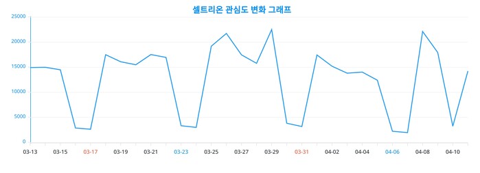 또한, 셀트리온에 대한 일간 변화 추이를 보여주는 차트는 셀트리온에 대한 관심이 어떻게 변화하고 있는지를 상세하게 보여준다.