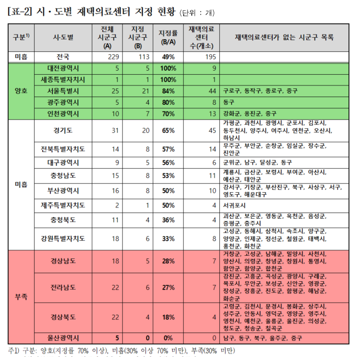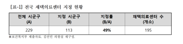국회 보건복지위원회 김선민 조국혁신당 의원이 보건복지부로부터 받은 자료에 따르면, 전국 229개 시군구 중 113곳(49%)에서만 재택의료센터가 운영 중이다.
