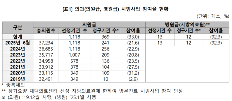 올해 종료를 앞둔 ‘일차의료 방문진료 시범사업’ 역시 의원급 참여율이 저조, 지역별 참여율 격차도 큰 것으로 드러났다.