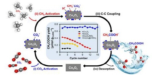 | ▲ 산화코발트(CoxOy)를 이용하여 이산화탄소와 메탄의 순차적 활성화 과정을 통해 아세트산을 제조하는 순환형 반응 사이클 (사진=전남대학교 제공) |