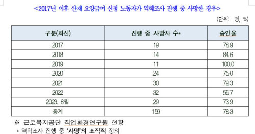 이 같은 통계는 산재로 유족급여 승인을 받은 이들 중 요양급여를 신청한 이력이 있는 이들을 산출해 나온 것이라고 공단은 설명했다. 현재 공단은 산재 신청자가 처리 중 사망했을 때는 요양급여 신청을 반려 처리하는데 반려 사유별 통계는 별도로 관리하지 않고 있었다.