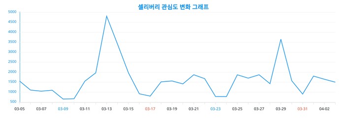 이번 분석을 통해 얻어진 셀리버리에 대한 일간 변화 추이 차트는, 셀리버리에 대한 관심이 어떻게 변화했는지를 드러낸다.