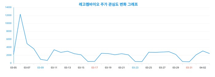 이번 분석을 통해 얻어진 레고켐바이오 주가에 대한 일간 변화 추이 차트는, 레고켐바이오 주가에 대한 관심이 어떻게 변화했는지를 드러낸다. 이 차트는 레고켐바이오 주가의 시간에 따른 인기 변동성을 직관적으로 이해할 수 있는 지표이다.