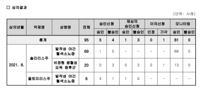 울토미리스주의 경우 PNH에 대한 승인신청 5건 가운데 4건을 승인하고 1건을 불승인했다. 재심의 승인신청 1건은 승인했다.