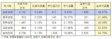 2022년 상반기 생명보험사 의료자문건수를 조사한 결과, 630만9704건의 보험금 청구건수중 8758건(전체건의 0.13%)을 의료자문을 의뢰했는데, 이중 1636건이 보험금 지급을 거부했고(의료자문건수의 18.6%), 3835건이 보험금을 깎거나 일부만 지급(43.79%)한 것으로 드러났.