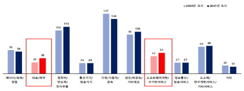 | ▲ 2020년 조사 대비 2021년 조사의 업종별 벤처천억기업 수 (자료=중소벤처기업부 제공) |