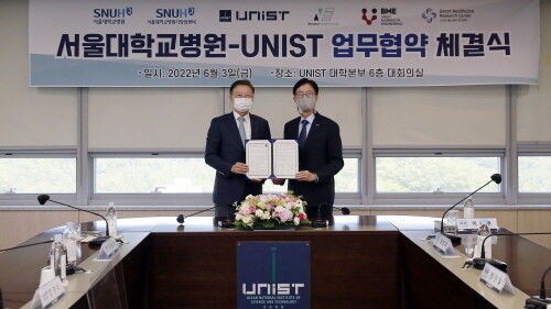 | ▲ 왼쪽부터 김연수 서울대학교병원장과 이용훈 UNIST 총장 (사진=UNIST 제공) |