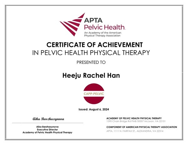 한희주 대표는 미국 물리치료사 협회(APTA) 골반 건강 물리치료학회에서 인증한 CAPP-Pelvic 자격을 취득한 골반저물리치료 분야의 전문가이다. 2021년 한국에 미국 물리치료사 협회의 교육이 시작된 이후로 해당 자격을 취득한 사람은 한희주 대표가 유일하다. 미국 물리치료사협회 골반건강학회(APTA pelvic health)는 1977년에 설립된 복부 및 골반 건강 분야의 세계적 권위 기관으로서, 전 세계의 여성, 골반건강 물리치료 전문가를 교육, 양성, 옹호하고 사회를 건강하게 변화시키고자 하는 비영리 교육연구 단체이다.