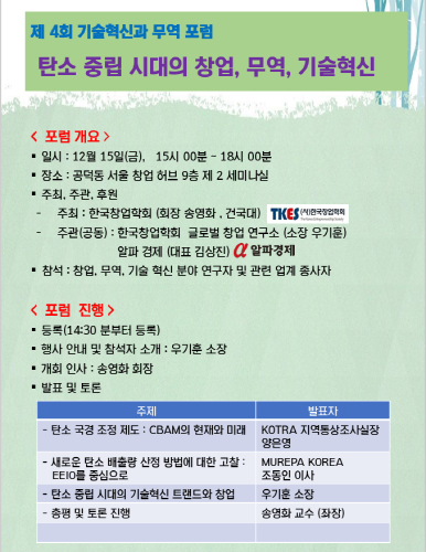 한국창업학회 글로벌 창업연구소와 알파경제가 공동 주관하는 ‘제4회 기술혁신과 무역 포럼’이 오는 15일 서울 창업허브에서 개최된다.