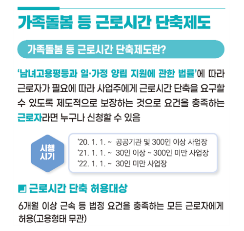 ‘가족돌봄 등 근로시간 단축제도’는 근로자가 가족돌봄 등의 사유로 근로시간의 단축을 사업주에게 신청할 수 있는 권리(근로시간 단축 청구권)를 제도적으로 보장한 것으로, 2020년 공공기관 및 300인 이상 사업장을 대상으로 최초 시행됐으며, 기업규모 별로 2022년까지 단계적으로 확대 시행된다.