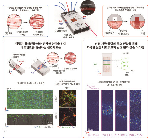 이에 연구팀은 방향성을 가진 상태로 정렬돼있는 뇌 속 신경 회로망의 특성을 모사하기 위해 뇌 신경 조직 내 신경세포들이 일정한 방향으로 정렬된 상태에서 배양이 되도록 하는 방법을 고안했다. 이와 동시에 체외 3차원 환경에 형성된 조직의 다양한 생화학적 인자가 포함된 액체가 흐를 수 있는 미세한 크기의 통로(미세 유체 마이크로채널)들을 집적시키는 기술을 동시에 구현할 수 있는 3차원 뇌 신경 조직 칩 제작 기술을 개발했다.