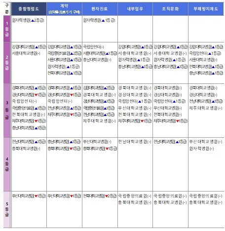 전남대학교병원(▲1등급)과 충북대학교병원(-)은 4등급을, 부산대학교병원은 1등급이 하락해 5등급이 됐다.