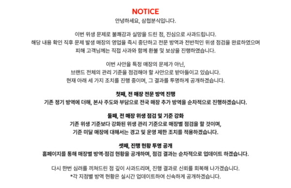 삼첩분식은 공식 사회관계망서비스(SNS)와 자사 홈페이지 공지를 통해 “위생 문제로 고객께 큰 불쾌감과 실망을 드린 점 진심으로 사과드린다”고 밝혔다. 이어 “내용 확인 직후 해당 매장은 즉시 영업을 중단했다”며 “전문 방역과 함께 매장 전반의 위생 점검을 실시하고 원인을 확인하고 있다”고 덧붙였다.
