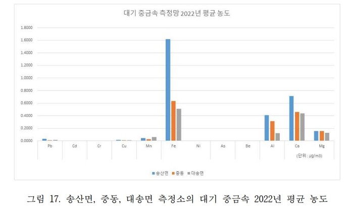대기 중금속은 모든 측정소에서 철(Fe), 알루미늄(Al), 칼슘(Ca), 마그네슘(Mg) 등이 전반으로 높게 나타났다. 그런데 현대제철 당진제철소 인근 송산측정소에서 Fe, Al, Ca, Pb(납), 비소(As) 등은 다른 측정소에 비해 높게 나타났다.