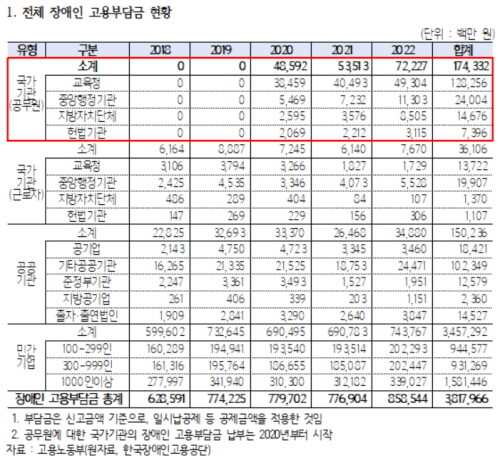 국회 환경노동위원회 소속 더불어민주당 김영진 의원이 고용노동부로부터 제출받은 '2018~2022 장애인 의무고용 이행 현황' 자료에 따르면, 최근 3년간 중앙정부 및 지방자치단체 등 국가기관이 장애인 공무원 의무고용 비율을 지키지 못해 신고한 장애인 고용부담금이 1743억 원에 달하는 것으로 나타났다. 이는 민간기업을 포함한 전체 장애인 고용부담금 총액의 4.6%에 해당하는 것으로, 같은 기간 공공기관이 신고한 947억 원의 2배에 가까운 수치다.