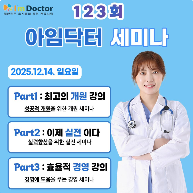 10만 의사 커뮤니티 아임닥터가 주최하고 의료건강전문매체 메디컬투데이가 후원하는 제123회 아임닥터 세미나가 오는 12월 14일 서울 강남구 아이파크타워 3층에서 개최된다.