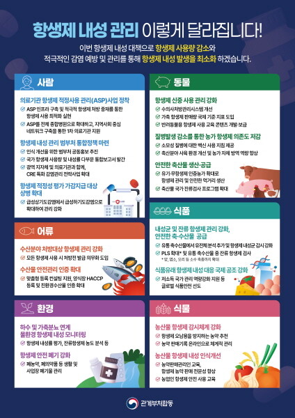 정부는 범부처 협력을 강화하는 한편, 항생제 올바른 사용에 대한 대국민 홍보를 상시 추진하고 의사·수의사와 농·축·수산 및 식품 업계 종사자 등을 대상으로 전문 교육을 확대할 방침이다.