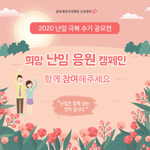 분당제일여성병원 난임센터는 제1회 2019 난임 바로 알기 캠페인, 제2회 2020 희망 난임 응원 캠페인에 이어 ‘난임은 함께 넘는 언덕’이라는 슬로건 아래 실제 난임과 불임을 겪었던 부부들이 직접 자신의 경험을 전달하면서 난임과 불임으로 고민 중인 많은 부부들에게 따뜻한 위로와 희망의 메시지를 전달하는 제3회 희망 난임 응원 캠페인 난임 극복 수기 공모전을 진행했다.