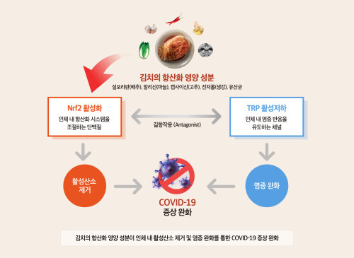 연구팀은 김치에 풍부한 설포라판(배추), 알리신(마늘), 캡사이신(고추), 진저롤(생강) 등 각종 영양 성분과 발효 과정에서 생기는 유산균이 인체 내 항산화 시스템인 Nrf2와 상호 작용하여 코로나19로 야기되는 인체 내 유해한 활성 산소를 제거한다는 사실을 밝혀냈다.
