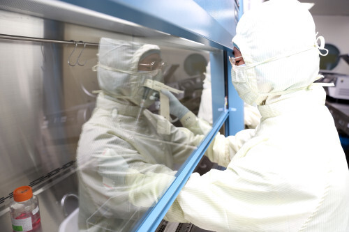 ▲첨단바이오의약품 제조를 위해 작업자가 생물안전작업대(BSC)에서 세포를 수집하고 있다 (사진=차바이오텍 제공)