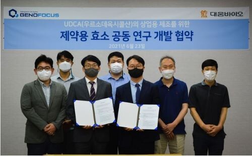 제노포커스는 지난 23일 장기적으로 사업의 경쟁력을 높이고자 대웅바이오와 ‘UDCA(우르소데옥시콜산: Ursodeoxycholic acid)를 친환경적으로 제조할 수 있는 특수 효소 개발 및 공동 발전을 위한 업무협약’을 체결했다고 24일 밝혔다.