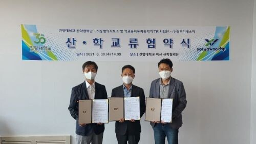 | ▲영우디에스피-건양대 ‘지능형 의지보조 및 의료용이동기기 트랙레코드 구축사업단’, 업무협약식 체결 모습 (사진= 영우디에스피 제공) |